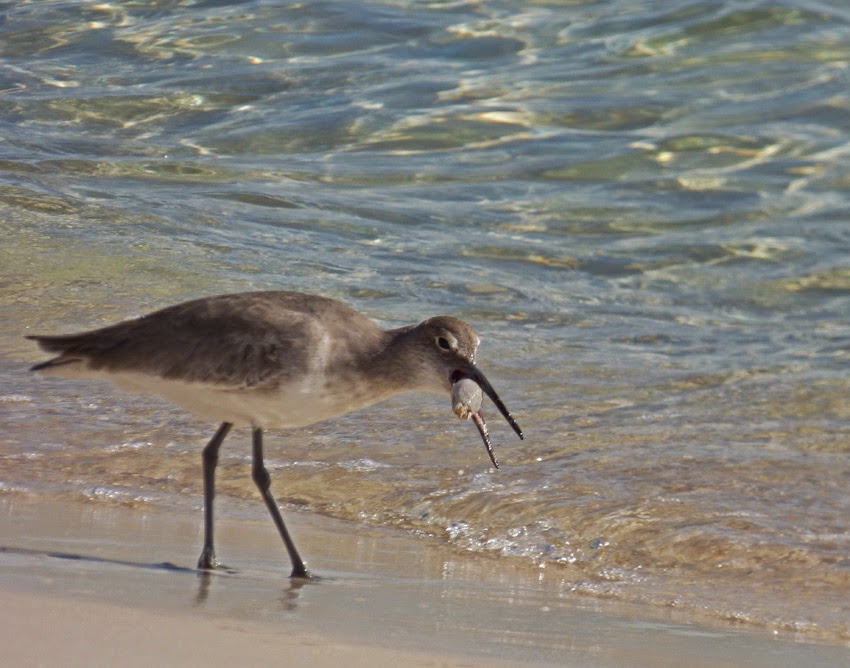 We found some mystery birds, standing belly deep in the water. I thought they might be Godwits or some other sandpiper, but now I think they were Willets, even though I've never seen a Willet standing so deep in the water.
